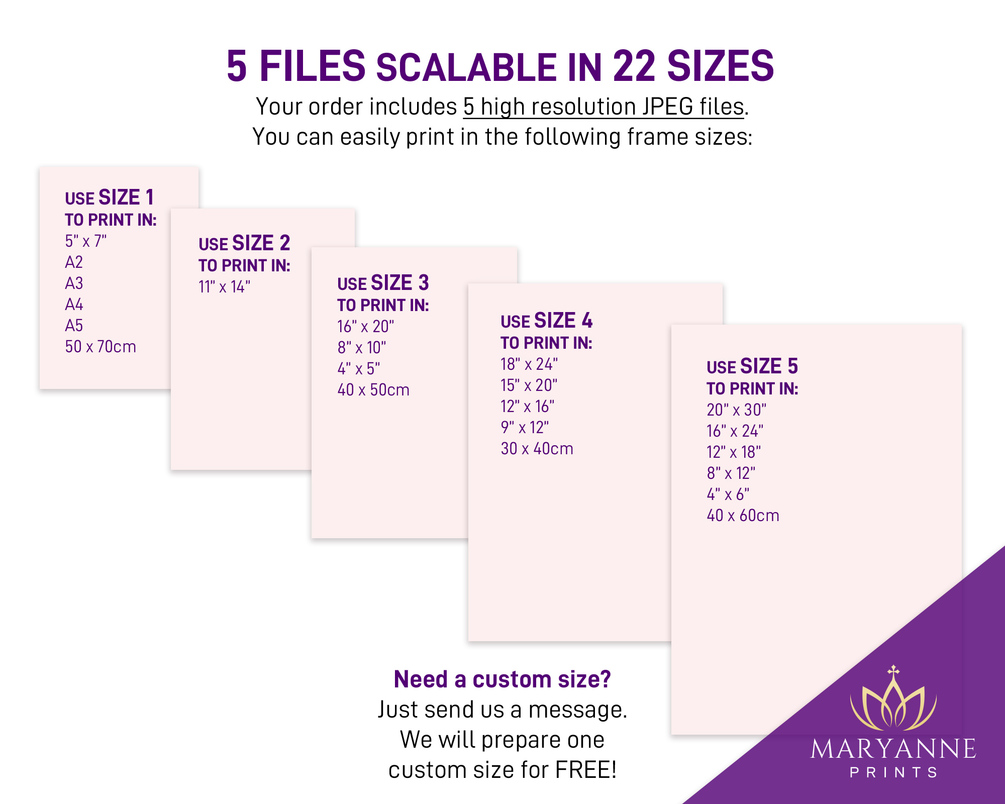 You'll receive a zip file with 5 High Resolution JPEG format (300 DPI) files, scalable in 20+ sizes.